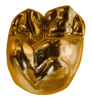 The 'gold' standard. Dental gold is about 60% gold alloy which is meant to match the hardness of the enamel of opposing teeth so both wear about evenly, an important trait.Gold does not tarnish or corrode and has some bacterial inhibiting quality. Gold crowns are strong and will not break. However, gold crowns obviously are not considered esthetic; they are gold colored. So usually gold crowns are used for lower back molars because they don't show there.
